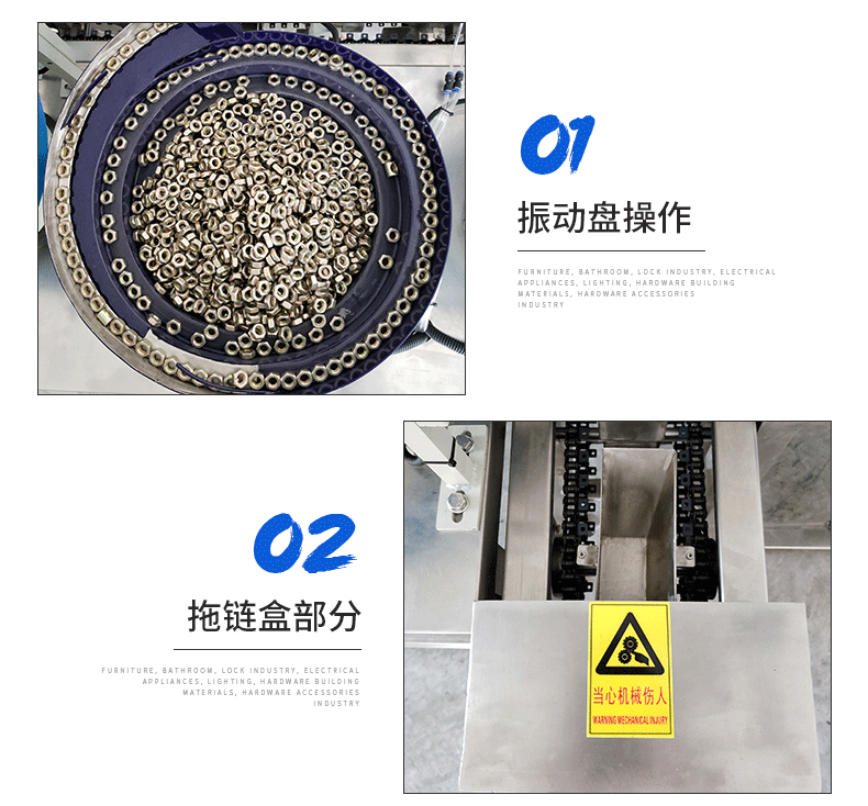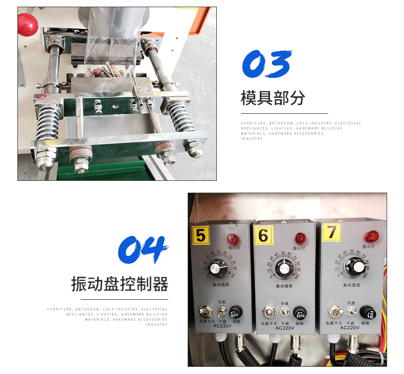 可帶多個振動盤,目前是20套振動盤,可同時將多種不同的物料包裝到包裝袋內(nèi),您也可以選擇性地用其中的一個、兩個、三個或四個振動盤(即單款單獨包裝、2款混合包裝、3款混合包裝、4款混合包裝);廣泛應(yīng)用于家具、衛(wèi)浴、鎖業(yè)、電工、電器、燈飾、五金建材等制造工業(yè)的附屬安裝螺絲、五金配件。