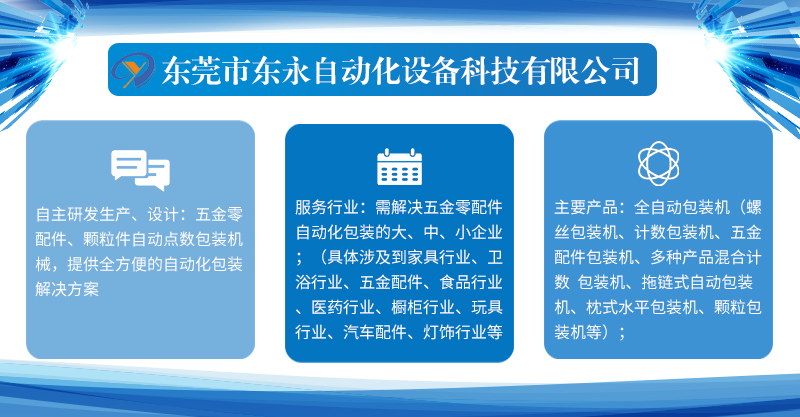 東莞市東永自動化設(shè)備科技有限公司自主研發(fā)生產(chǎn)的自動螺絲包裝機(jī),針對于家具、衛(wèi)浴、鎖業(yè)、電工、電器、燈飾、五金建材等制造工業(yè)的附屬安裝螺絲、五金配件,可自動完成計量、計數(shù)、制袋、充填、封和、切袋等工序。本機(jī)技術(shù)先進(jìn)、操作方便、工作穩(wěn)定,替代了預(yù)制袋成形方式,大大提高了工作效率,成功應(yīng)用于各大型知名企業(yè)的附件自動包裝。